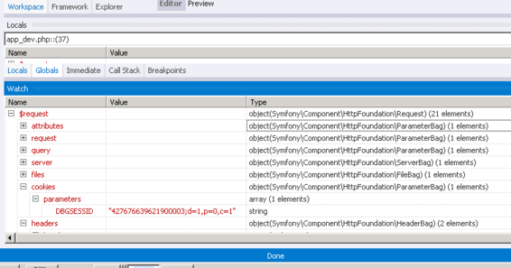 PHPEd debugger was used to conduct interactive debugging on the PHP Globals level, the front controller, router and controller components. Again the major benefit here is the productivity gain. We expect such debugging power in IDE's.