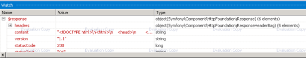 As we iterate over the code, we eventually reach the point where the Request and Response objects are set. The breakpoints ensure that the code execution halts so we can view the structure of the objects in the watch list.